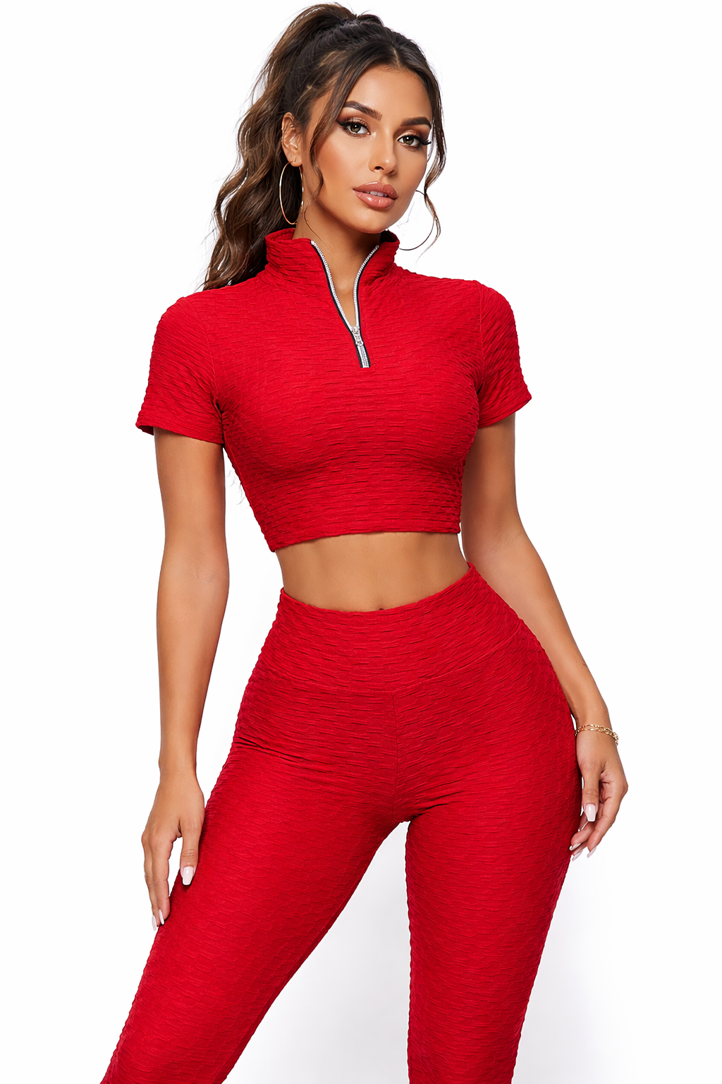 Designed to flatter your shape while keeping you comfortable all day, this matching set features a short-sleeve textured crop top with a sleek front zip-up high-neck design, paired with your choice of high-waisted leggings or high-waisted biker shorts. The sculpting fit and textured stretch fabric create a bold, premium look that enhances your silhouette while providing a flexible and supportive feel.