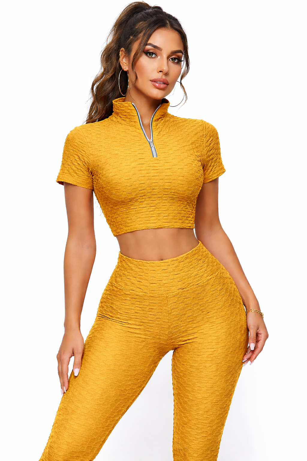 Designed to flatter your shape while keeping you comfortable all day, this matching set features a short-sleeve textured crop top with a sleek front zip-up high-neck design, paired with your choice of high-waisted leggings or high-waisted biker shorts. The sculpting fit and textured stretch fabric create a bold, premium look that enhances your silhouette while providing a flexible and supportive feel.
